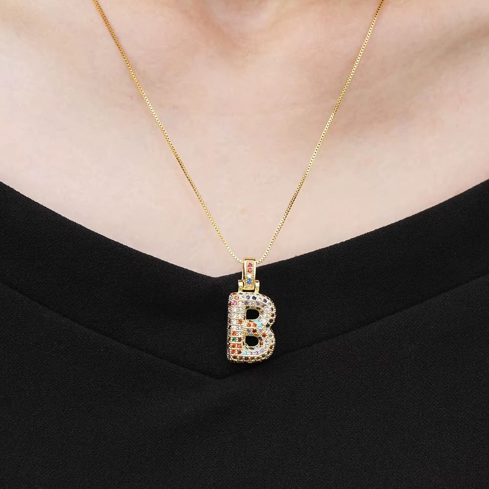 Cada letra está diseñada en 3D con forma redondeada tipo burbuja, cubierta con circonitas de colores cuidadosamente engastadas a mano.