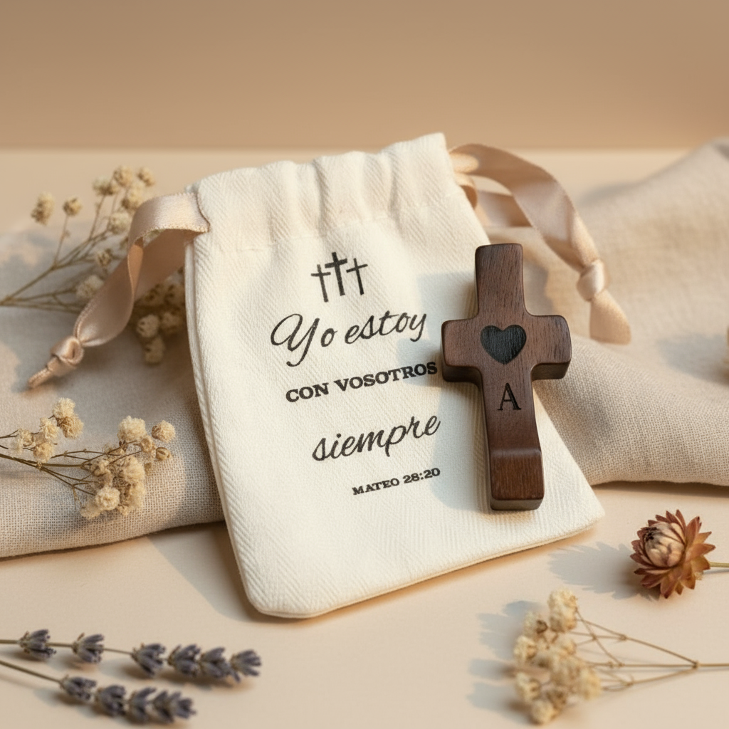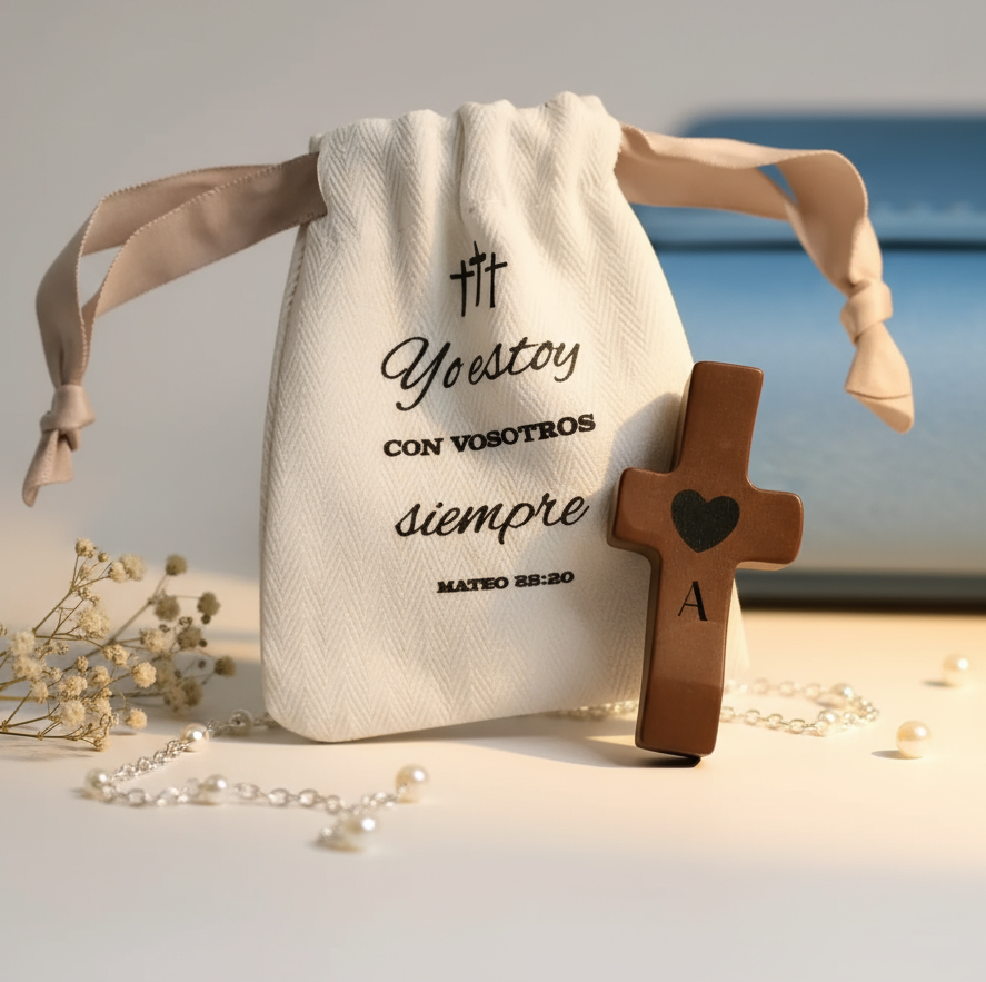 Cada cruz se entrega lista para regalar, dentro de una bolsita individual de algodón natural, que incluye un mensaje bíblico inspirador, elegido para transmitir luz y esperanza.
