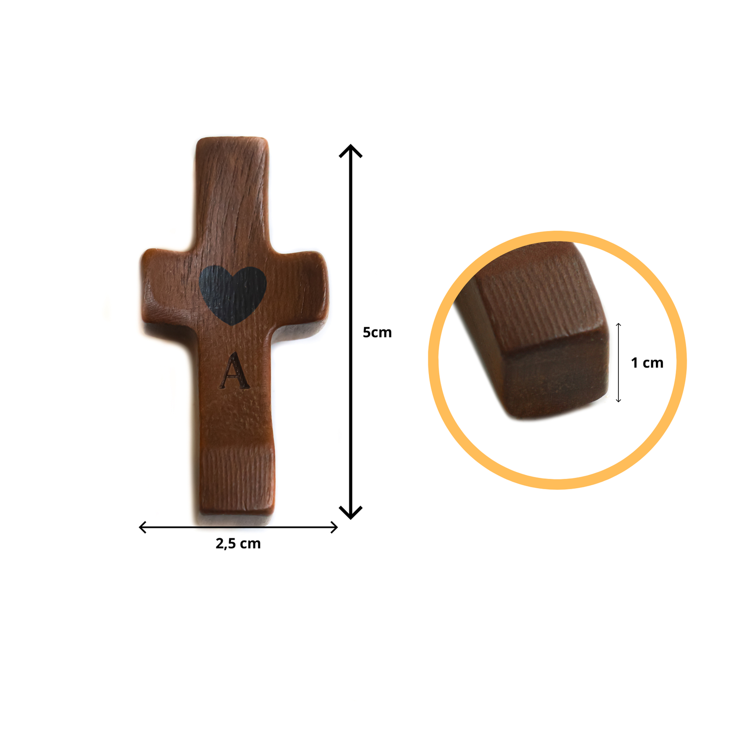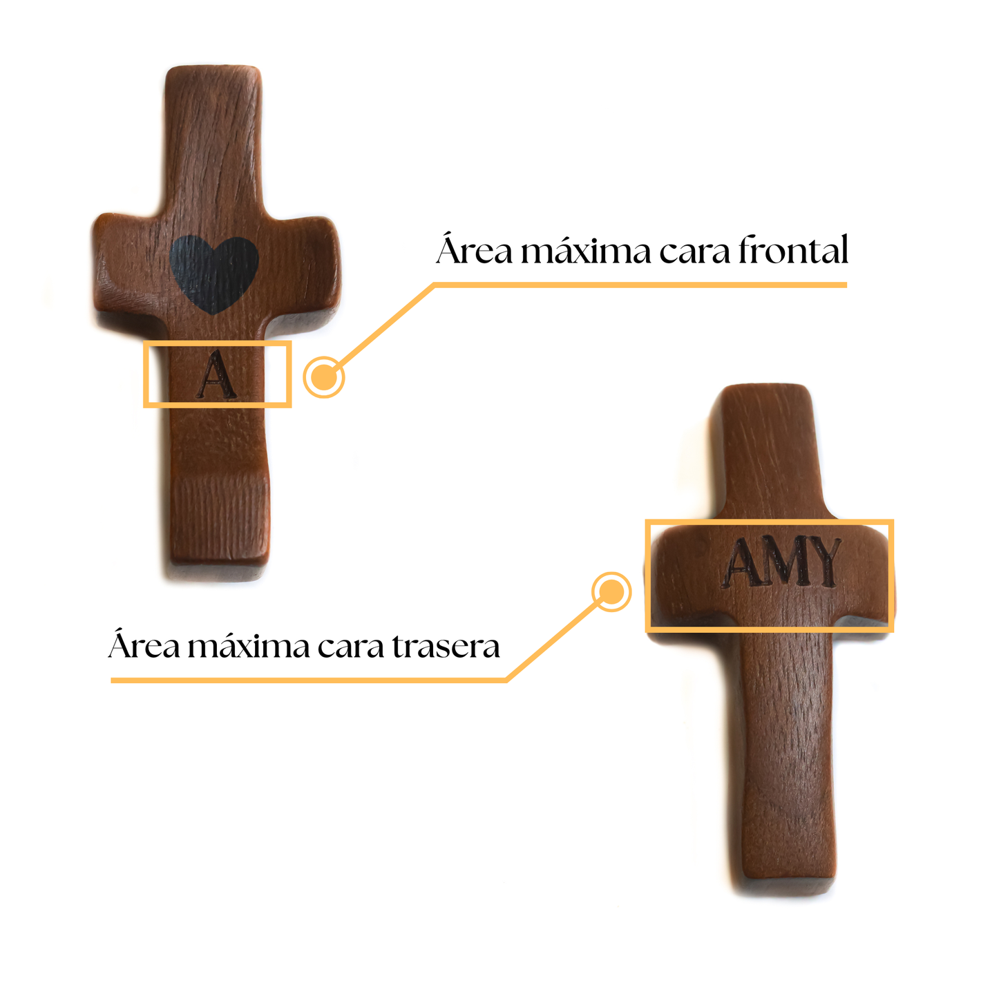 Cada cruz se convierte en una pieza única gracias a su grabado láser personalizado, incluido sin coste adicional. Puedes añadir tu
