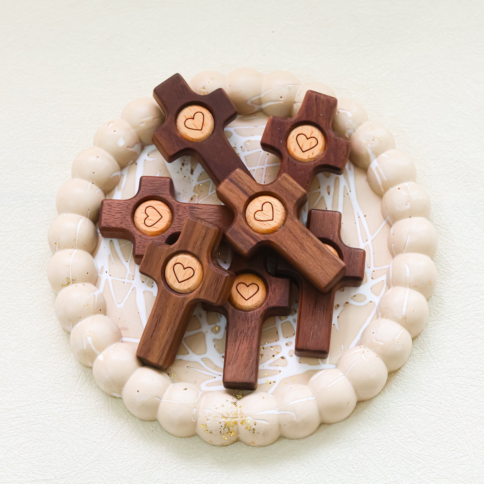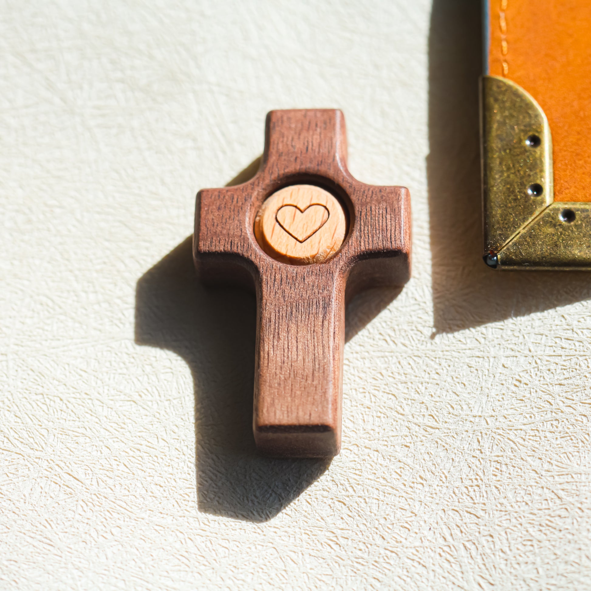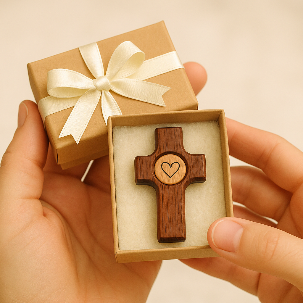 El grabado del corazón en el centro de la cruz representa la unión entre fe y amor. Es un detalle sencillo y a la vez poderoso, que convierte esta pieza en mucho más que un objeto decorativo: es un símbolo de conexión, ternura y espiritualidad.