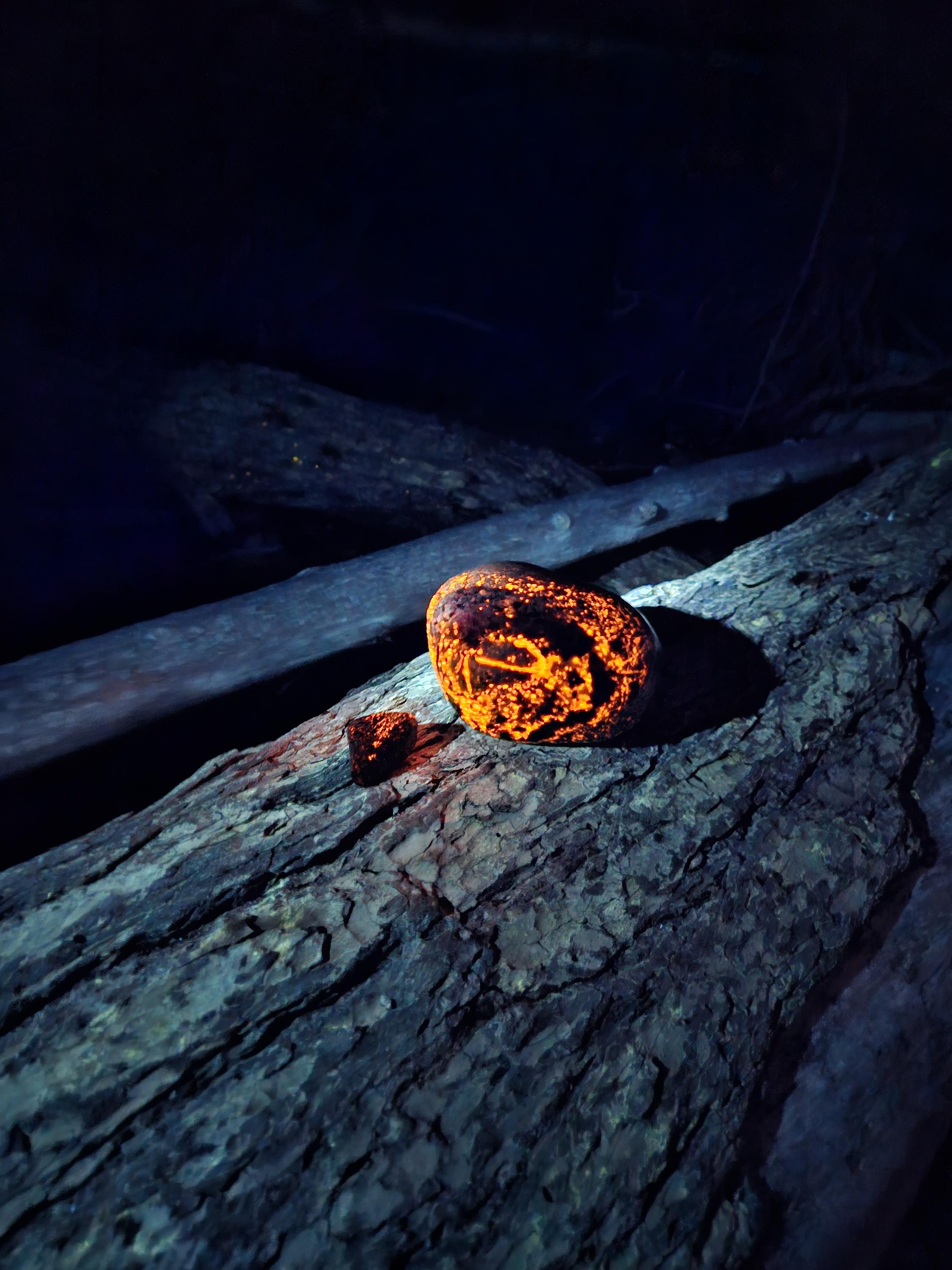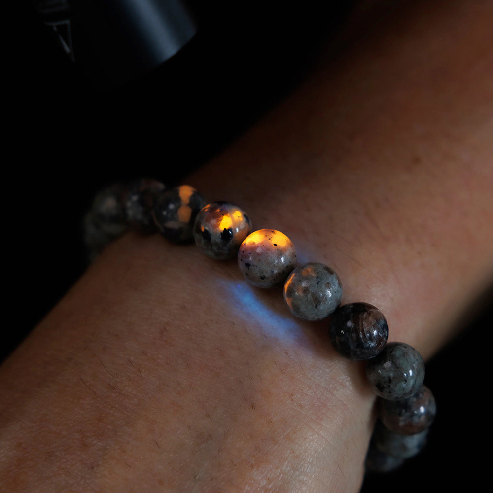 Este fenómeno no es común en piedras tan discretas a simple vista: durante el día, la Yooperlita puede parecer una roca grisácea moteada, pero al llegar la oscuridad... revela su verdadera naturaleza.