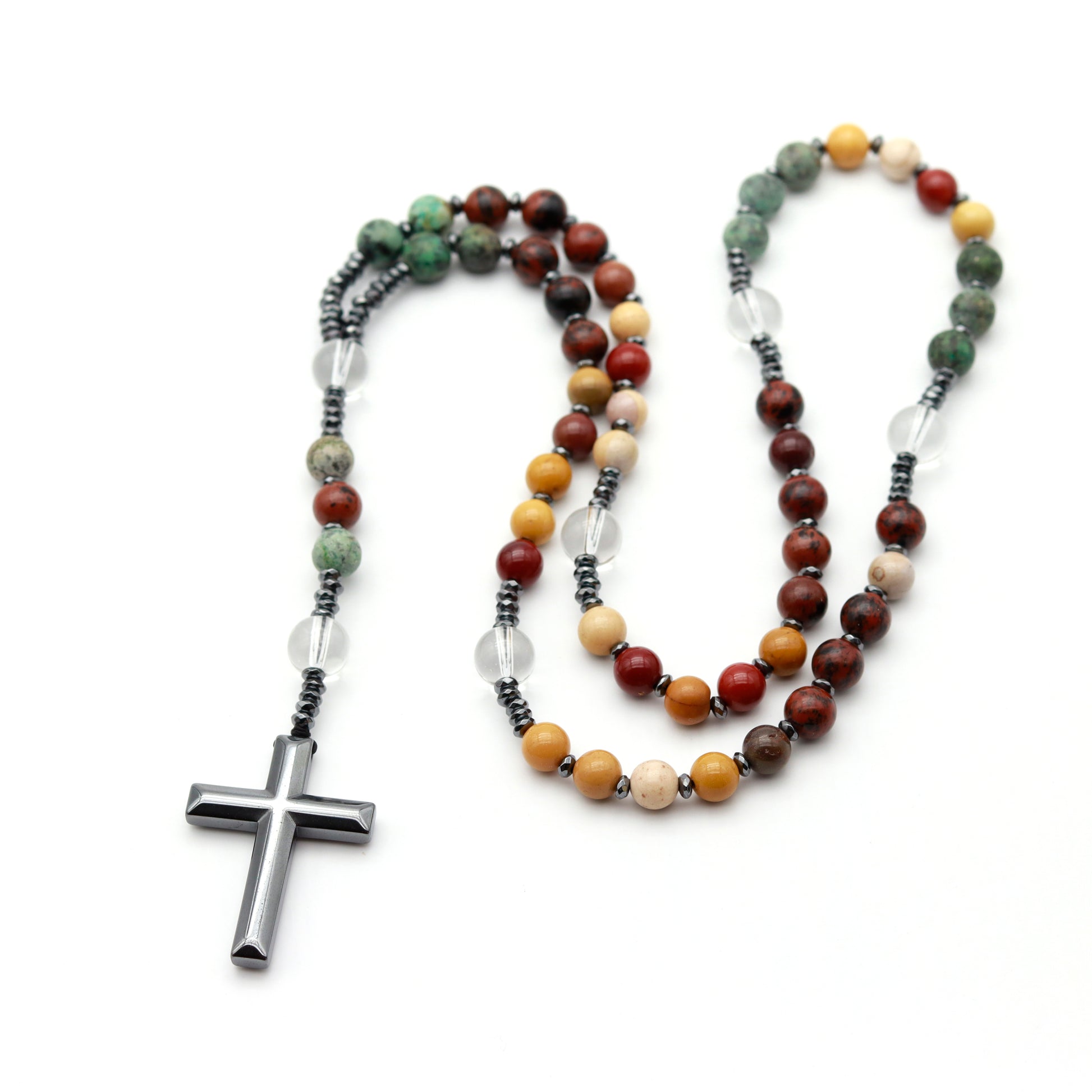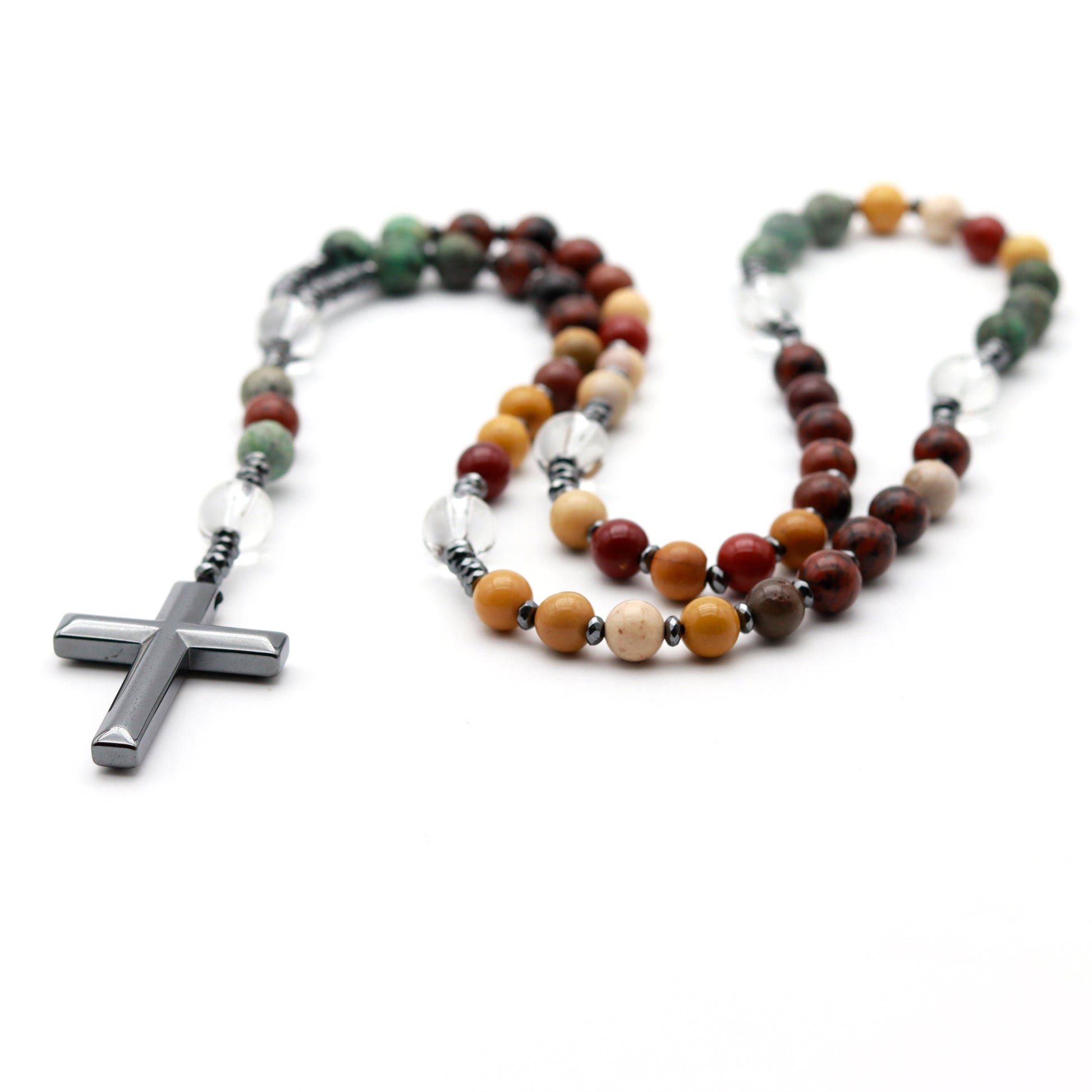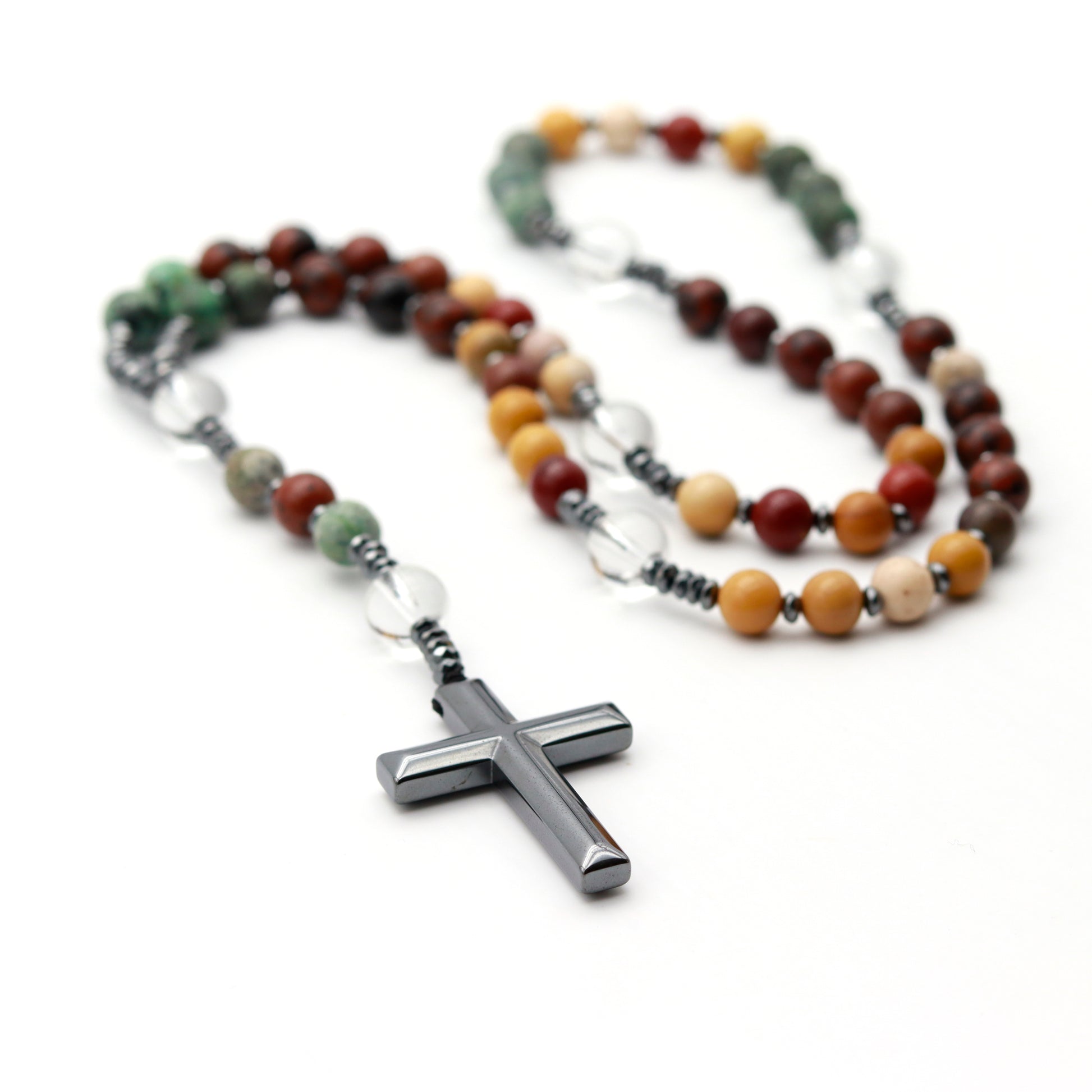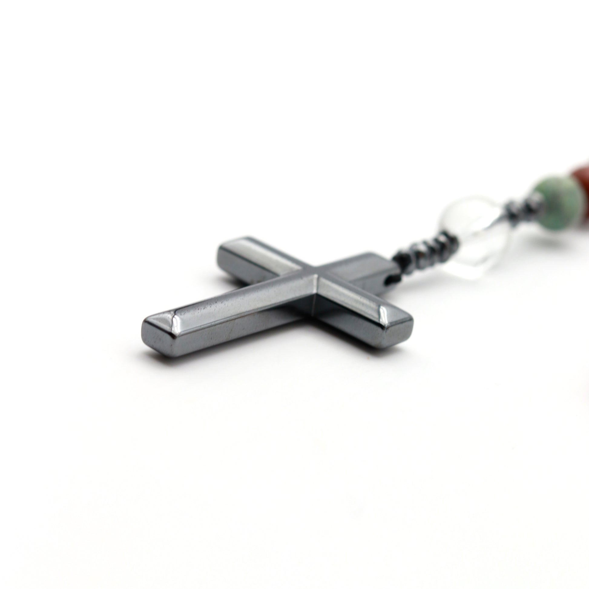 Cada cuenta de jaspe y hematita en el rosario representa un momento de reflexión y contemplación, guiando al usuario a través de un viaje espiritual de paz y serenidad. Ya sea utilizado como una herramienta para la meditación o como una expresión de fe, este rosario es un recordatorio tangible de la belleza y la profundidad de la espiritualidad. Su combinación única de jaspe y hematita crea una experiencia sensorial y espiritual que inspira a aquellos que lo utilizan a encontrar calma y conexión en medio del ajetreo de la vida cotidiana.